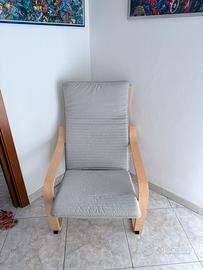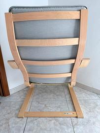 Vendo sedia IKEA modello Poäng con struttura in legno curvato e cuscino colore grigio chiaro.