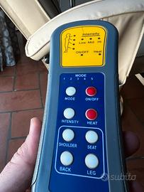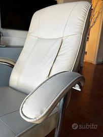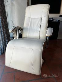 Vendo per inutilizzo una sedia in pelle color beje chiaro con piede centrale cromato girevole ed azione massaggiante dalle spalle alle gambe. La parte anteriore si può regolare per supportare ed alzare le gambe. Molto stabile, zero difetti, come nuova.