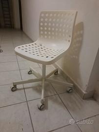 Vendesi sedia Ikea in plastica bianca. L'oggetto è usato ma è in buone condizioni. Vi è solo un piccolo difetto a una ruota, ma che non compromette la funzionalità e la stabilità della sedia.