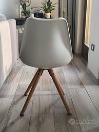 Sedia bianca in plastica con seduta in ecopelle e gambe in legno, altezza seduta 45 cm, altezza complessiva con schienale 80 cm, larghezza 48 cm, profondità seduta 40 cm.