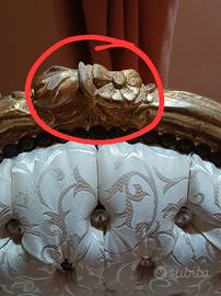 sedia vintage restaurata e rinforzata in legno color oro effetto antichizzato , imbottitura con stoffa beige a fantasie floreali perlate, schienale trapuntato con bottoni effetto zircone ( uno mancante).