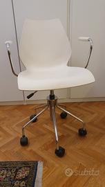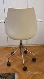 Sedia con ruote da ufficio bianca con supporto in acciaio e leva per sollevare ed abbassare la seduta.