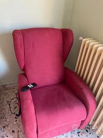 Sedia bordeaux con telecomando per alzata, reclinamento e ruote per spostamento; adatta per anziani o persone con difficoltà motorie. Ritiro in loco.