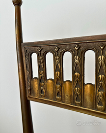 Schienale alto traforato con arcate decorative e dettagli fogliati in rilievo.