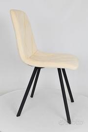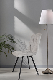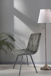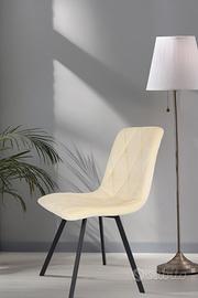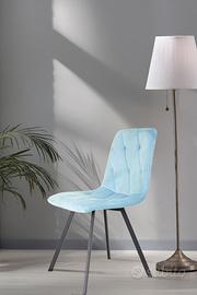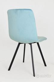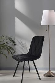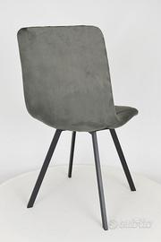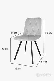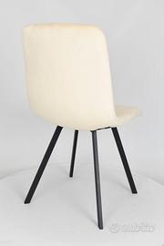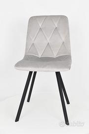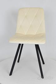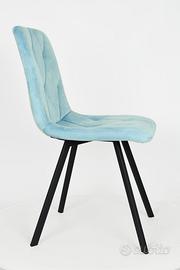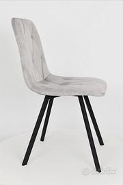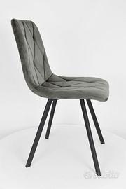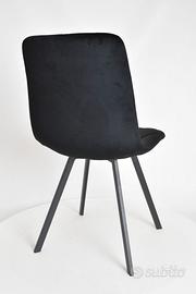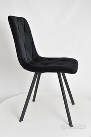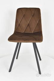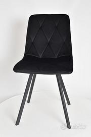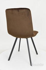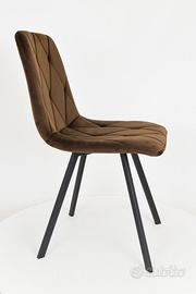 Sedia nuova imbottita e rivestita in velluto disponibile in cinque varianti di colore (marrone, grigio scuro, grigio perla, sabbia, nero) con gambe in acciaio verniciato nero opaco e piedini piatti. Richiede un semplice assemblaggio. Le misure totali del prodotto sono: 45x55x86cm.