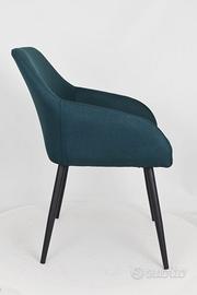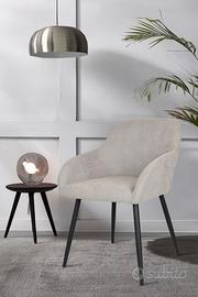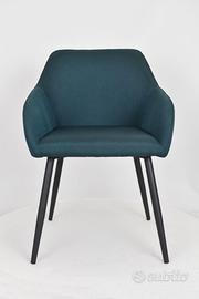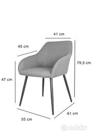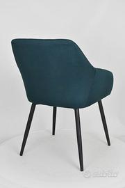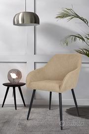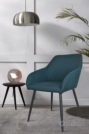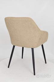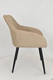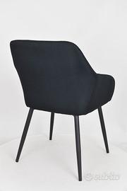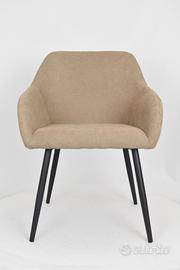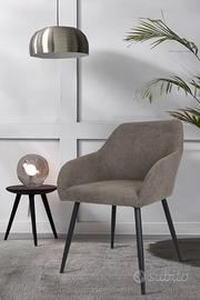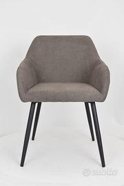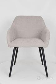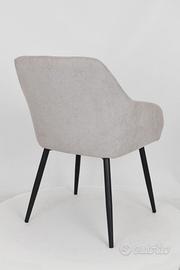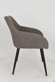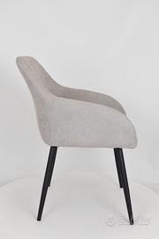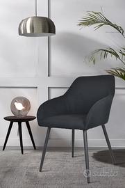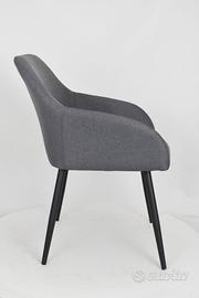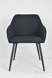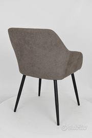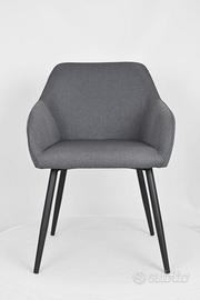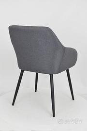 Sedia nuova imbottita e rivestita in tessuto disponibile in sei varianti di colore (grigio scuro, grigio cemento, grigio chiaro, nero, camoscio e ottanio) con gambe in acciaio verniciato nero opaco e piedini piatti.