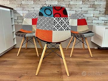 Il vero protagonista è il rivestimento in tessuto patchwork multicolore, che dona alla sedia un carattere unico e distintivo. Ogni seduta è un'esplosione di colori e motivi, rendendo ogni pezzo unico nel suo genere.