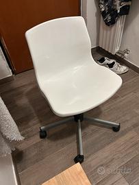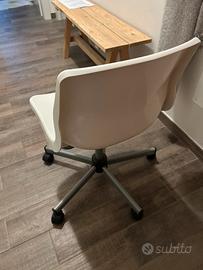 Sedia da scrivania cameretta bianca con ruote, una delle quali non funzionante.