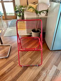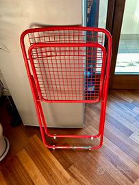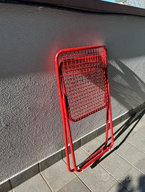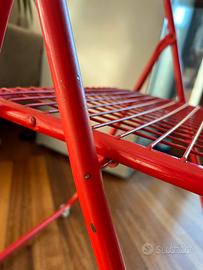 Sedia Rappen / Ted Net disegnata da Niels Gammelgaad negli anni ‘70. Metallo rosso laccato. Ci sono dei segni visibili in foto. Perfetta per giardini, terrazzi o interni. Ho attaccato sulla base delle clips con dei feltrini per non rovinare il terreno, ma sono facilmente rimovibili. Solo ritiro a mano in zona Dergano (MI)