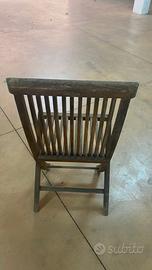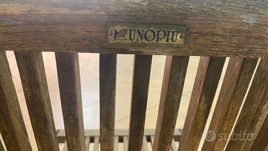 Sedia pieghevole Unopiù modello William in teak, arredo outdoor design Originale sedia pieghevole Unopiù modello William, realizzata in teak, essenza particolarmente apprezzata per l’arredo da esterno grazie alla sua solidità, durata e resa estetica nel tempo. La sedia presenta una linea essenziale ed elegante, con schienale e seduta a listelli, tipica del design outdoor di qualità firmato Unopiù. Ideale per giardino, terrazza, veranda o anche come complemento d’arredo per ambienti interni dal gusto naturale e contemporaneo. Caratteristiche: marca: Unopiù modello: William struttura pieghevole materiale: teak Misure: altezza totale: 97 cm larghezza: 45 cm Le condizioni generali sono buone, con normali segni del tempo e dell’uso visibili sul legno, coerenti con la tipologia dell’oggetto e con l’utilizzo outdoor. Le fotografie fanno parte integrante della descrizione e mostrano lo stato reale della sedia. L’oggetto si trova a Grosseto ed è possibile visionarlo previo appuntamento da concordare tramite messaggio. È possibile il ritiro in loco da parte dell’acquirente. Prezzo: euro 230,00