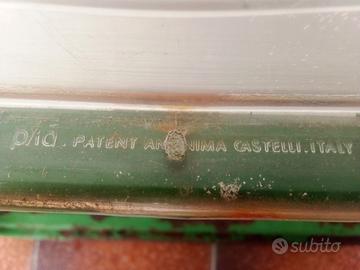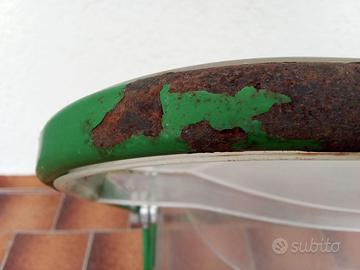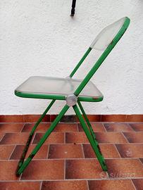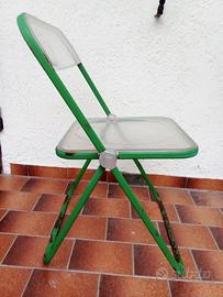 Sedia Pieghevole PLIA designer Giancarlo Piretti, produzione Anonima Castelli (originale anni ‘60) Struttura in metallo verniciato verde, schienale e seduta trasparente (integri). Dimensioni L 47 x P 46 x H 75,5 altezza seduta da terra 46 cm. Usata, lasciata volutamente nella condizioni originali quindi con la struttura in metallo corrosa superficialmente con la vernice originale e le parti in plastica trasparente leggermente opacizzate e graffiate (vedi foto).