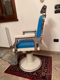 Questa è un’affascinante poltrona da barbiere vintage, un vero pezzo di storia dell'artigianato italiano firmato dalla storica ditta "Amata" di Catania, come indicato chiaramente sulla pedana in ghisa.