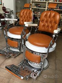 Antiche poltrone da barbiere Scuderi Catania con seduta rotonda, originali dell'epoca, completamente restaurate, fatturabili. Vari colori disponibili, tutte dotate di pistone idraulico, rivestimenti in vera pelle pieno fiore di prima scelta.