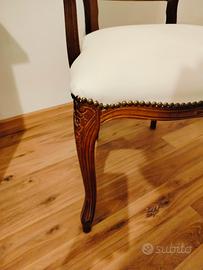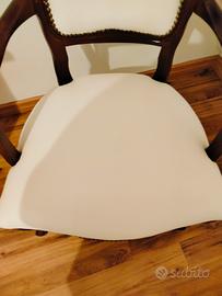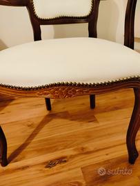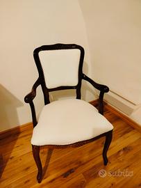 Vendo sedia/poltroncina classica in legno noce intagliato ed ecopelle bianca nuovissima, mai usata, tenuta in esposizione solo per pochissimo tempo. Sedia perfetta, nessun difetto, nessun graffio. NIENTE. NUOVA. Bellissima per arredare angoli di salotto, in camera da letto, ecc...Prezzo non trattabile. (Già troppo basso).