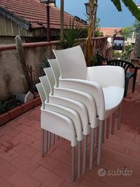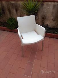 set 4 sedie poltroncine marca pedrali brend italiano leader nel settore colore bianco ,piedini in alluminio scocca in policarbonato ,impilabili + tavolo con base in tubolare in ferro ,regolabile qualsiasi altezza e piano in marmo brasiliano vede candejas 60 x60 prezzo set completo € 200 . ampia disponibilità.