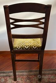 Sedia antica in legno (primi ‘900) con schienale a doghe e seduta imbottita in velluto verde con motivo geometrico. Seduta appena ritappezzata e imbottita. H85 L48 P40