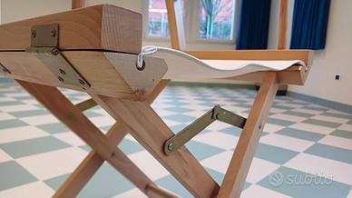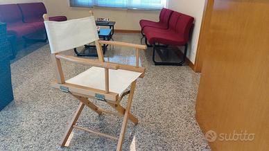 Disponibili 45 sedie da regista pieghevoli con struttura in legno di ciliegio verniciato naturale. La seduta squadrata e schienale rettangolare sono composti da un lembo di tessuto bianco, incastrato nella struttura. Sfere decorative alla fine dello schienale. Braccioli squadrati. Le zampe sono a X con un piccolo inserto in metallo, il quale permette la chiusura della sedia.