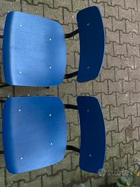 Seduta e schienale in legno curvato laccato blu, struttura in metallo nero molto stabile.
