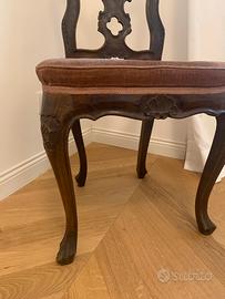 Sedia in stile barocco veneziano, legno di noce con bellissimi intagli eseguiti a mano. Autentiche della seconda metà 1800. Buone condizioni. Possibilità di seconda sedia da restaurare nella seduta inclusa nel prezzo.