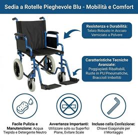 App Life Sedia a Rotelle Pieghevole Leggera Transito per Disabili ed Anziani, Dispositivo Medico di Classe I con Braccioli, Pedane ribaltabili ed Estraibili Blu 💪 Resistenza e Durabilità: La carrozzina è costruita con un robusto telaio pieghevole in acciaio verniciato a polvere, rinforzato in tutti i punti di carico per garantire massima resistenza e sicurezza. 🌟 Caratteristiche Tecniche Avanzate: Dotata di poggiapiedi ribaltabili e removibili con pedana regolabile in inclinazione, ruote anteriori in PU da 20 cm e posteriori magnetiche da 30 cm con pneumatici, braccioli imbottiti in PU ribaltabili, e un sedile di 46 cm di larghezza, può supportare fino a 120 kg. 🧼 Facile Pulizia e Manutenzione: Pulire con acqua tiepida e detergente neutro, asciugare con un panno pulito. Lubrificare periodicamente le ruote per mantenere il corretto funzionamento. Evitare l'uso di sostanze abrasive e corrosive. ⚠️ Avvertenze Importanti: Utilizzare esclusivamente su superfici piane, evitando terreni rocciosi o inclinati. Non utilizzare per salire o scendere le scale. Verificare sempre che tutte le parti siano correttamente montate e funzionanti prima dell'uso. 📦 Incluso nella Confezione: La carrozzina viene fornita con una chiave esagonale per il montaggio, garantendo un'installazione semplice e veloce.