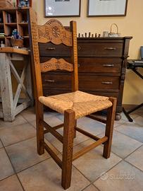 Vendo sedia sarda in rovere, acquistata da artigiano di Mogoro. La sedia presenta decorazioni e intagli della tradizione sarda, tramite lavorazione manuale il cui fondo impagliato è ottenuto dall'intreccio di erbe palustri sarde. La sedia ha l'altezza della seduta di 46 cm. la larghezza della seduta di 43 cm. l'altezza della spagliera 93 cm. da terra.