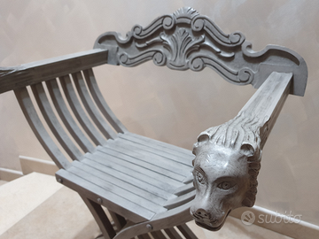 Magnifica sedia Savonarola in legno Massello, ottime condizioni, con bellissimi particolari intarsiati sullo schienale, pomelli con teste di leone e piedi con zampa di leone.