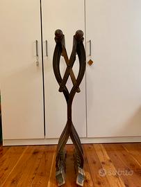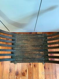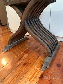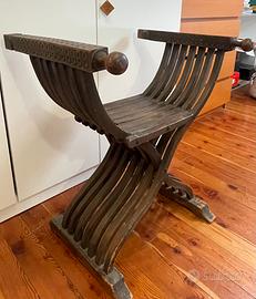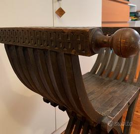 Savonarola originale in legno con braccioli intagliati e pieghevole. Presenta segni di usura, soprattutto sulle basi, dove tra l’altro manca un pezzo di uno dei piedi (come mostrato in foto). Ritiro in loco.