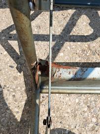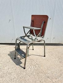 Sedia con scaletta in metallo e formica, produzione Rama anni 50/60. Sedia con 4 gambe in metallo, seduta e schienale in formica marrone, sollevando il pannello della seduta si aziona il meccanismo che apre la scaletta a 3 gradini. Oggetto funzionale e pratico, veloce da trasformare in base all'occorrenza in sedia o scala. Design classico in stile mid century italiano. Sul primo gradino è presente il marchio Rama. Buone condizioni generali con segni di utilizzo e dell'età, qui viene presentata nel suo aspetto vissuto dal sapore industriale tuttavia è possibile lucidare le parti metalliche da macchie di incrostazioni e vernici per rinnovarne l'aspetto. Si evidenzia in foto una crepa sotto il gradino intermedio.