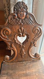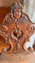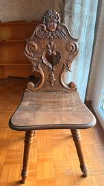 Vendesi splendida sedia rustica in stile alpino/tirolese (modello Sgabello), interamente realizzata in legno massiccio e lavorata artigianalmente. Caratteristiche principali: • Schienale artistico: Splendido intaglio a mano raffigurante un volto di putto/cherubino alato. • Dettagli: Presente il classico foro centrale a forma di cuore e decorazioni floreali punzonate nel legno. • Gambe: Tipica struttura a quattro gambe tornite divergenti, che garantisce stabilità e uno stile autentico d'altri tempi. • Stato: Buone condizioni vintage. La sedia è solida; la seduta presenta una naturale patina del tempo che ne accresce il fascino (come da foto). Ideale come pezzo d'arredo per una baita, un ingresso o come sedia da scrivania d'accento in un ambiente moderno.