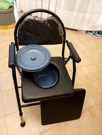 Sedia WC nuova, completa di tutti gli accessori (doppio secchio, bustine e spazzolino) per anziani o persone a mobilità ridotta.