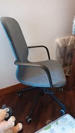 Vendo sedia IKEA Langfjall con braccioli fissi in metallo, girevole su ruote anti-graffio, colore celeste (tessuto) e nero (struttura), reclinabile e regolabile in altezza. Utilizzabile come sedia da ufficio o per riunioni. Acquistata a fine 2022 al prezzo di 169 €. Ottime condizioni. Vendo causa cambio arredamento.