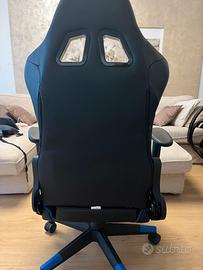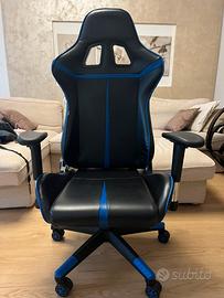 Sedia ufficio gaming ergonomica blu e nera, con due comodi cuscini.