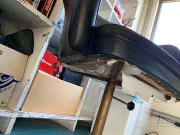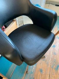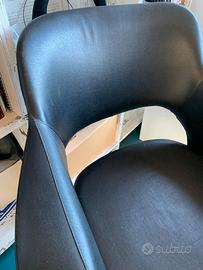 Vendesi splendida sedia da scrivania/ufficio originale degli anni '60, un pezzo autentico di modernariato perfetto per dare un tocco di stile industriale o vintage al proprio studio. La sedia presenta una scocca avvolgente dalla linea ergonomica e scultorea, tipica del design organico del periodo. Caratteristiche principali: Design: Linea "Space Age" con schienale a guscio aperto e braccioli integrati. Rivestimento: Similpelle (vinile) nera originale dell'epoca in ottime condizioni di conservazione superficiale (no tagli evidenti sulla seduta). Base: Struttura girevole a quattro razze in metallo con finitura bronzata/ottonata originale e piedini regolabili "a fungo". Meccanismo: Dotata di manopola inferiore per la regolazione dell'inclinazione/molleggio. Condizioni: L'oggetto è un pezzo vintage autentico. La struttura portante e il rivestimento superiore sono solidi e ben conservati. La tela sottoscocca (nascosta) è usurata e necessita di essere riposizionata o sostituita, dettaglio che non pregiudica l'estetica una volta posizionata. La base presenta una bellissima patina del tempo che ne certifica l'originalità. prezzo leggermente trattabile