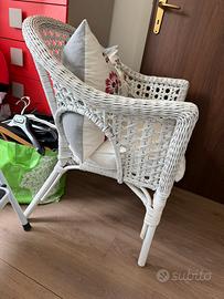 Vendo poltroncina in vero vimini intrecciato a mano, realizzata dal negozio di artigiano Albert di Ravenna. Pezzo unico, non industriale. Verniciata bianco opaco, stile shabby chic/provenzale. Perfetta per camera, salotto, veranda o angolo lettura. Schienale avvolgente e molto comoda. *Dettagli:* - *Materiale*: Vimini naturale intrecciato + struttura in legno - *Colore*: Bianco opaco con cuscino seduta ecru incluso - *Dimensioni*: circa 70x70x85h cm, seduta 45 cm da terra - *Stato*: Usata in ottime condizioni, nessun difetto, intreccio integro Il cuscino con ricamo floreale in foto lo regalo se interessa.