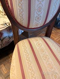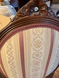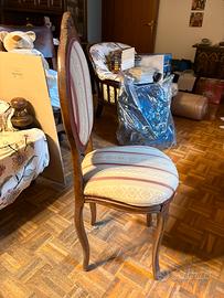 Vendo elegante sedia d'epoca con schienale a medaglione, in stile Luigi Filippo. Un pezzo di squisita fattura, ideale per arredare con un tocco classico una camera da letto, un ingresso o uno scrittoio. Caratteristiche: • Struttura: Legno massiccio con raffinati intagli artigianali sulla sommità dello schienale e sulle gambe. • Rivestimento: Tessuto damascato a righe con motivi floreali nei toni del crema e bordeaux. Imbottitura ancora solida e confortevole. • Stato: Molto ben conservata, legno lucido e tessuto pulito. Logistica: ⚠️ SOLO RITIRO A MANO (Viste le dimensioni, non spedisco). 📍 Disponibile a Bologna o Castel San Pietro Terme (BO).