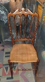 una sedia di Chiavari (o "chiavarina" o "campanino") in legno con seduta impagliata. L'impagliatura della seduta è tradizionalmente realizzata a mano utilizzando strisce di salice palustre o canna d'India.