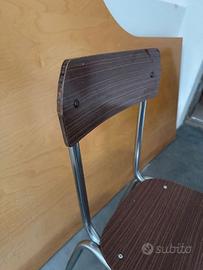 Vendo sedia vintage / modernariato in stile industriale – scuola / ufficio anni ‘60 / ‘70, con struttura in tubolare metallico e seduta + schienale in formica effetto legno scuro (laminato).