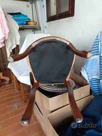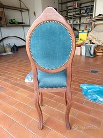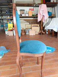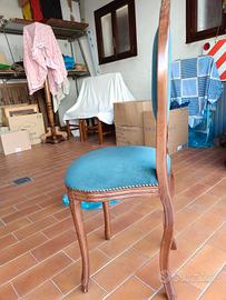 Sedia vintage un legno intarsiato con seduta e schienale in velluto azzurro , ottimo stato nessun segno , macchie o graffi . Gradito ritiro a mano in Padova città