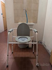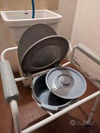 Rialzo stabilizzante per WC, portatile e comodo, con un secchio removibile con coperchio per la tua igiene personale. Caratterizzato da un telaio in alluminio leggero, braccioli in plastica e gambe regolabili in altezza dotate di piedini antiscivolo in gomma per una maggiore sicurezza e stabilità. usato si, ma come nuovo😁