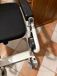 Sedia regolabile da toilette/doccia da trasferimento Brand: Identites, Sedia Moovy manuale consente di prendere il carico facilmente, senza sforzo per l'assistente dell'anziano/disabile e senza rischio di dolore per l'assistito. La sedia consente il trasferimento dal letto alla doccia o alla toilette comodamente e in sicurezza e variando l'altezza tramite comandi elettrici. la persona assistita sia sufficientemente collaborativa ed abbia il controllo del tronco e della testa. La sedia Moovy è dotata di ruote con freni, cintura di sicurezza, schienale e braccioli. Può essere usato nella doccia.