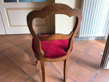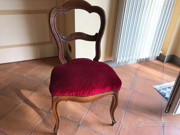 Gruppo di 4 sedie dell '800, una delle quali da rivedere nella struttura inferiore del sedile (come da foto), ricoperte di velluto rosso. Legno sano.