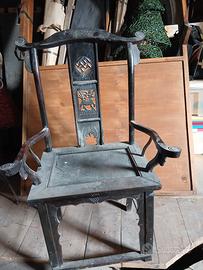 Descrizione Questa coppia di sedie antiche cinesi con schienale alto a giogo presenta uno schienale ornato da un raffinato simbolo buddista intagliato per la pace e l'affetto, fiori su un ramo e una spalliera sporgente. Il restauro è stato volutamente ridotto al minimo. La finitura originale, ben invecchiata, ha lasciato una splendida patina su tutte le poltrone. La poltrona con schienale alto a giogo era anche comunemente chiamata Dimensioni: 60 cm L × 45 cm P × 120 cm H Stile: Antico asiatico Altezza seduta: 54 cm Numero di posti: 2 Epoca: Anni '20 Paese di origine: Cina Tipo di oggetto: Vintage, antico o Materiali: Olmo Condizioni: Buone condizioni, condizioni originali non alterate, alcune imperfezioni Colore: Nero Note sulle condizioni: Condizioni: Buone, segni, punti e imperfezioni coerenti con l'età e l'utilizzo.
