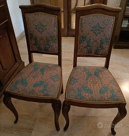 Vendo due eleganti sedie in legno massello, lavorazione artigianale, seduta imbottita e rivestita in tessuto resistente.