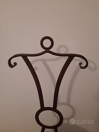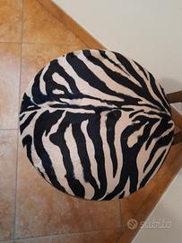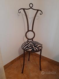 Coppia sedie arredo. Schienale appendigiacca. Tre piedi e schienale in metallo color bronzo. Seduta rotonda in tessuto morbido zebrato. Diametro seduta 35 cm. Altezza seduta 50 cm. Altezza schienale 65 cm. Larghezza schienale 45 cm. In ottimo stato. Vendo causa trasloco.