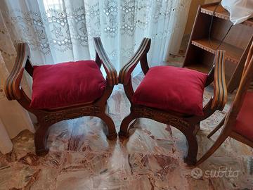 Sedie in legno con braccioli, con seduta rivestita in pelle. Stile classico. Colore bordeaux