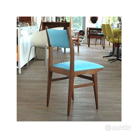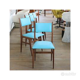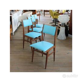 Quattro sedie in skai azzurro cielo, dalla linea pulita, degli anni 60'. Dimensioni: Larghezza 43 cm Profondità 44 cm Altezza 88 cm Altezza Seduta 45 cm Questo prodotto è in esposizione e disponibile al ritiro: presso lo showroom 39Vantini Oldstyle, via Rodoldo Vantini 39, 25126 Brescia