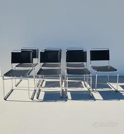 Sedia dal design italiano degli anni '70, caratterizzata da una struttura in acciaio tubolare cromato e seduta/schienale in pelle nera skai.