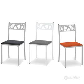 Lo schienale è caratterizzato da un motivo geometrico traforato che aggiunge un elemento di interesse visivo. La seduta, imbottita e rivestita in ecopelle, conferisce comfort e facilità di pulizia.