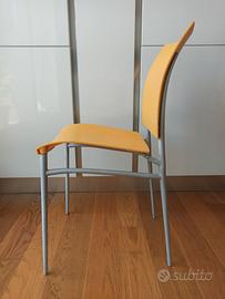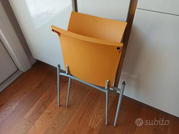 Richiudibili, struttura in alluminio, seduta e schienale in materiale termoplastico, colore giallo/arancio.