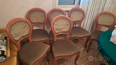 Vendo set di 6 sedie classiche anni 80 in legno, con seduta e schienale imbottiti e rivestiti in tessuto verde con finitura a borchie. Stile elegante ideali per sala da pranzo o arredamenti in stile tradizionale.